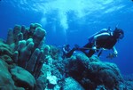 Researchers swimming/measuring above coral. Location: Dog Cemetary