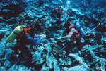 Researchers measuring in fron of large coral reef. Location: Dog Cemetary