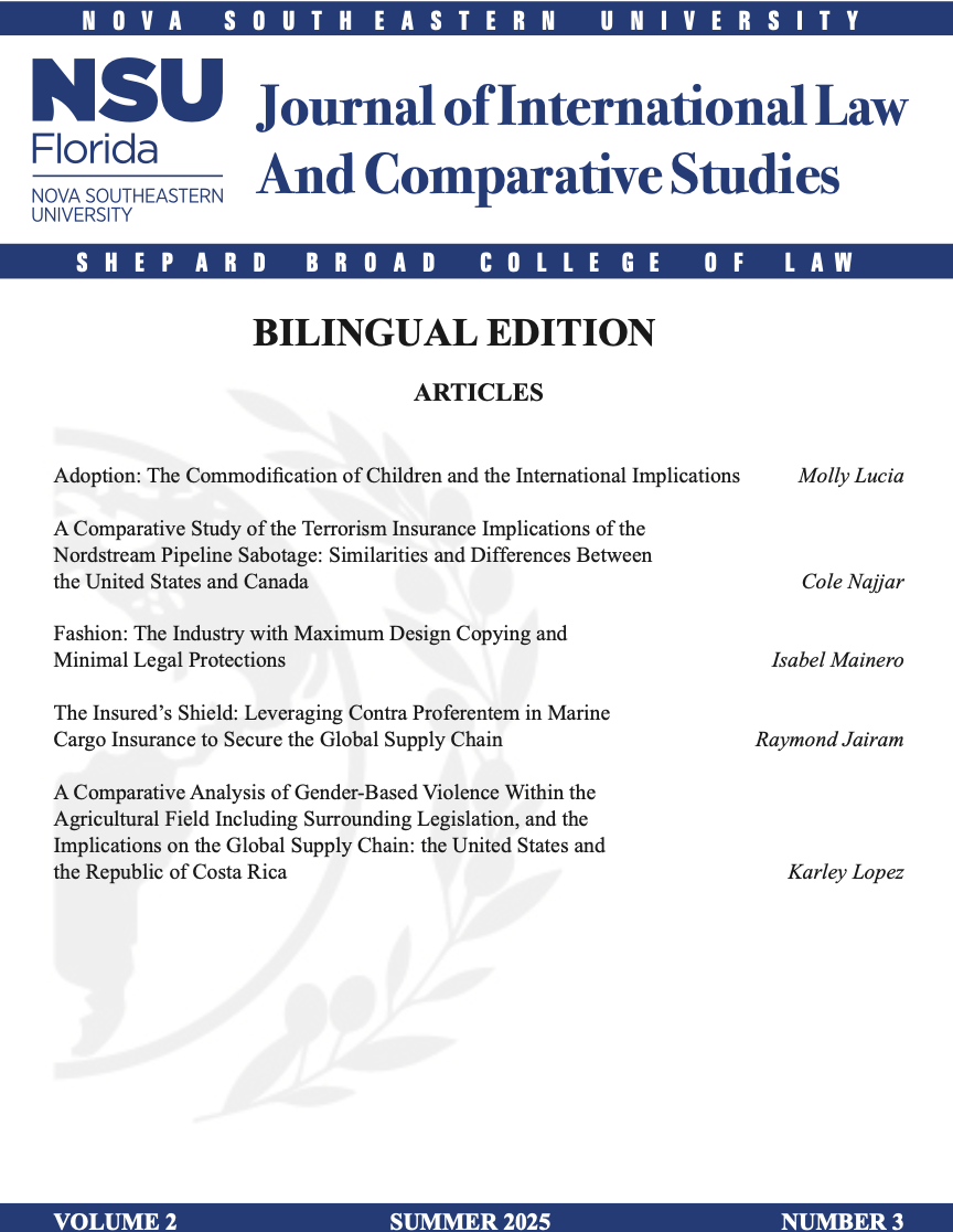 Annually, the Journal of International Law and Comparative Studies publishes three issues. The Journal strives to publish relevant articles that address contemporary legal issues internationally and of significant global importance, with this year’s theme of “International Law and the Global Supply Chain.” Volume 2, Issue 1 highlights several pressing global concerns, examining their legal, economic, and societal dimensions through comparative and international perspectives. Topics explored include the commodification of children in the context of international adoption, the insurance ramifications of terrorism as illustrated by the Nordstream Pipeline sabotage, vulnerabilities within the fashion industry caused by widespread design copying and limited protections, the use of contra proferentem in marine cargo insurance as a safeguard for the global supply chain, and the legal and social implications of gender-based violence within agriculture and its impact on international trade.