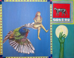 Suspended in Flight captures several signature elements of her art, including narrative symbolism, an emphasis on color, the use of partial or abstracted self portraits. Visually, it draws influence from each of her greatest recurring inspirations (René Magritte, Frida Kahlo, and Piet Mondrian) to form Cosper’s aesthetic foundation. Cosper also utilizes Surrealist imagery and ambiguous symbols—including animals, X-rays, dice, and distorted bodies—to create segmented vignettes of enigmatic moodscapes and windows into the inner worlds of herself and others.