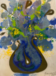 While his floral works are now executed in his recognizable and established style within the Plastic Paint Medium, they remain a bold expression of color. They also represent a bridge of continuity from his upbringing in Cuba to his international success upon relocating to the United States. This specific piece, Vase of Flowers, was created during the COVID-19 Pandemic and shows influence of his mentor Portocarrero, as well as Americans Jackson Pollock and Georgia O’Keeffe. He also used it to communicate a complex range of emotions and ideas. On the surface, it primarily represents an expression of hope, life, and a symbolic flourishing from within that, despite being contained in a vase, remaines connected to the natural world and universe at large. This is seen in outsized perspective of the petals, the bursting imagery arising from the vase, as well as the interstellar imagery that he has implied through the use of iridescent sparkling paint, which changes in hue based on the perspective of the viewer.